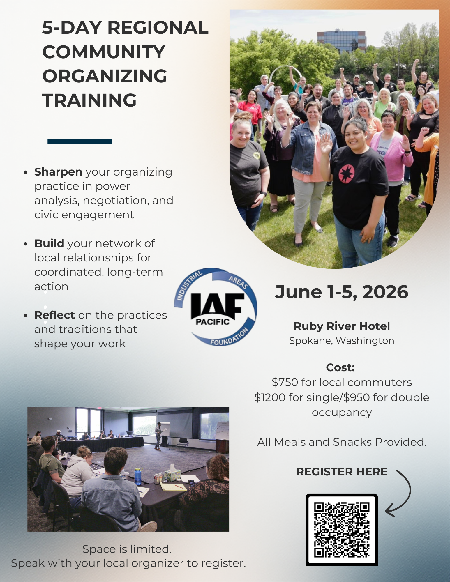 Join community leaders from across the Pacific region for an intensive, five-day advanced training in broad-based organizing. Build skills, deepen your analysis, and connect with peers from the IAF Pacific network, including leaders in Spokane, Seattle, Portland, and Missoula.